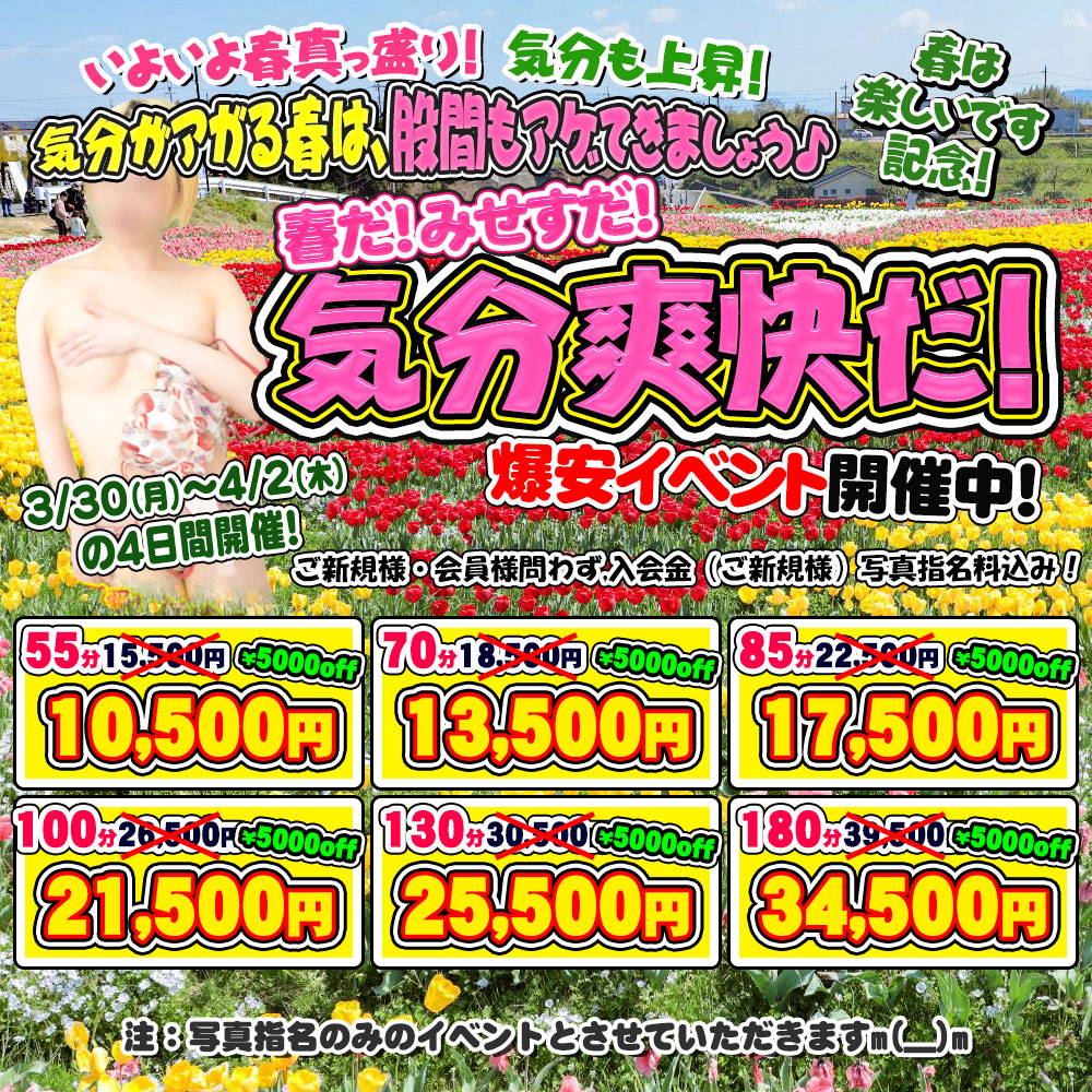 みせすスプリングダイブ 第5弾! いよいよ春真っ盛り! 気分も上昇! 気分がアガる春は、股間もアゲてきましょう♪ 春は楽しいです記念! ☆春だ!みせすだ!気分爽快だ!☆ 爆安イベント開催中! 3/30 …続きを見る