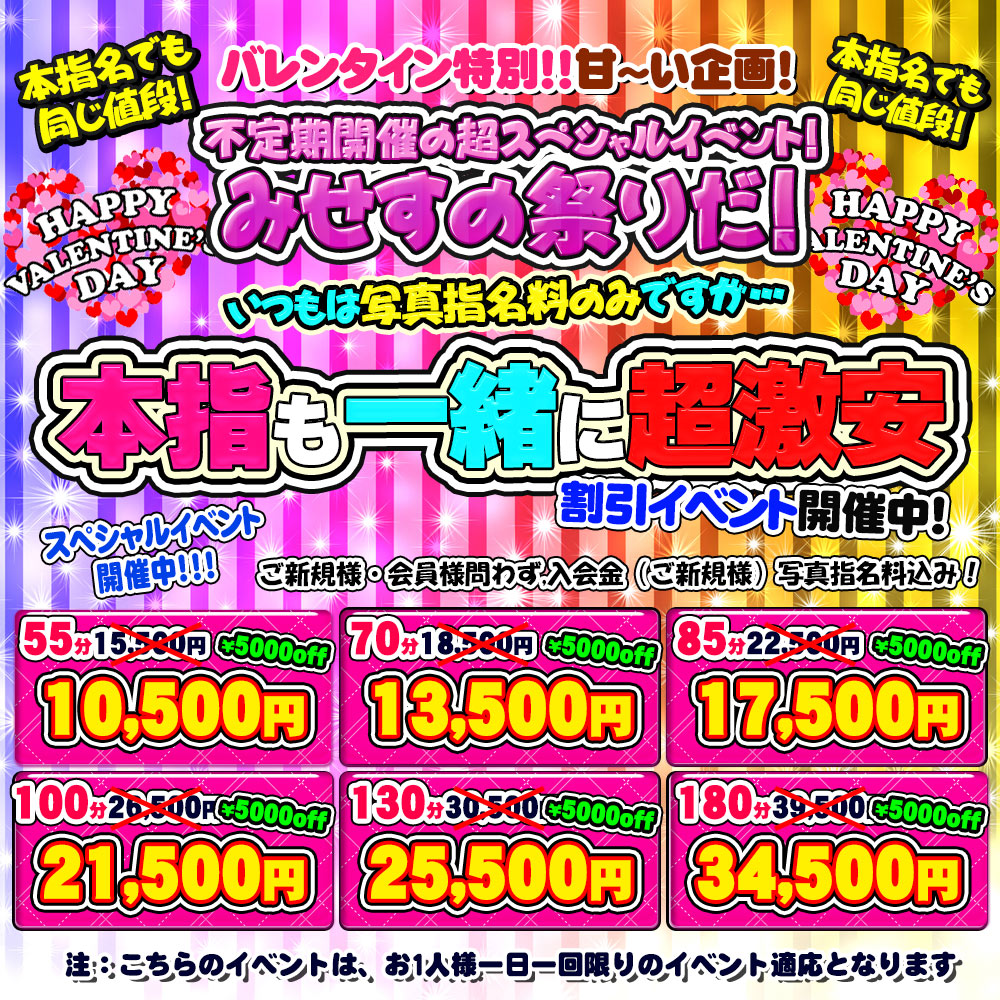 新着情報超絶限界割!不定期開催! ◆◆バレンタイン企画!◆◆ ☆みせすの祭りだ!ワッショイワッショイ! 本指名でも同じ値段で、盛り上がっちゃいましょう!!☆彡 本指名でも同じ値段で、盛り上がっちゃいましょう …続きを見る