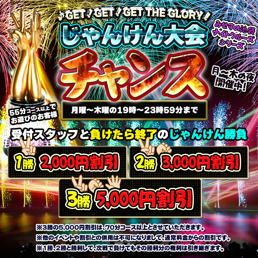 新着情報みせすの池袋ナイトクルーズシリーズ月~木の夜は、お客様ご自身の手で栄光をつかめ! ♪GET!GET!GET THE GLORY!! ◆夜の!じゃんけん大会チャンス!◆イベント 期間限定で開催中!! 月 …続きを見る